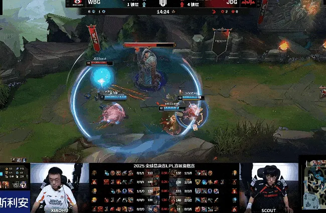 14分钟,WBG三人越塔Scout不成反被击杀一人,随后JDG双人组给出机会